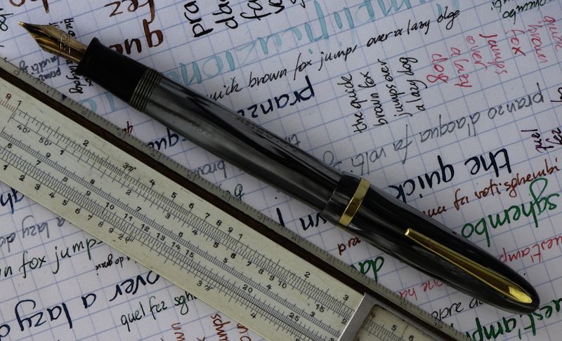Foto di una penna Aviostyl (un marchio della Giacomazzi). Caricamento a pulsante di fondo. Realizzazione in celluloide striata grigia. Modello in stile affusolato, veretta singola.