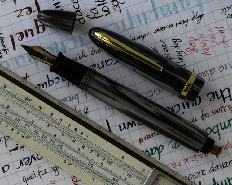 Photo of a pen produced by Aviostyl (a Giacomazzi trademark). Filling system: button filler. In striated gray celluloid. Streamlined style model, single band.