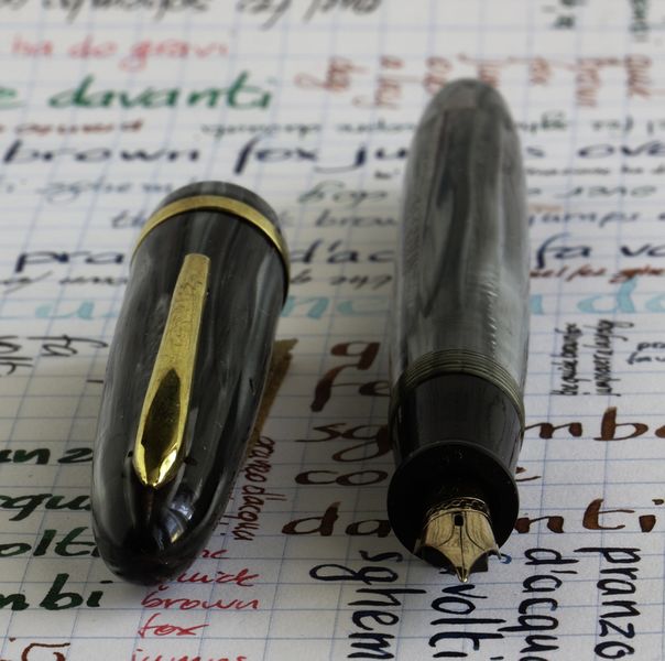 Photo of a pen produced by Aviostyl (a Giacomazzi trademark). Filling system: button filler. In striated gray celluloid. Streamlined style model, single band.