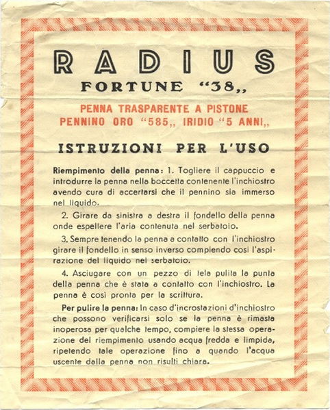 Scansione di un foglietto di istruzioni Radius (sottomarca Società Anonima Fabbrica Italiana Stilografiche) degli anni '50. Relativo ad un modello Fortune 38. Da una confezione originale Ritoccata dall'autore per una migliore nitidezza. Contributo di Antonio (utente forum fockerwulf).