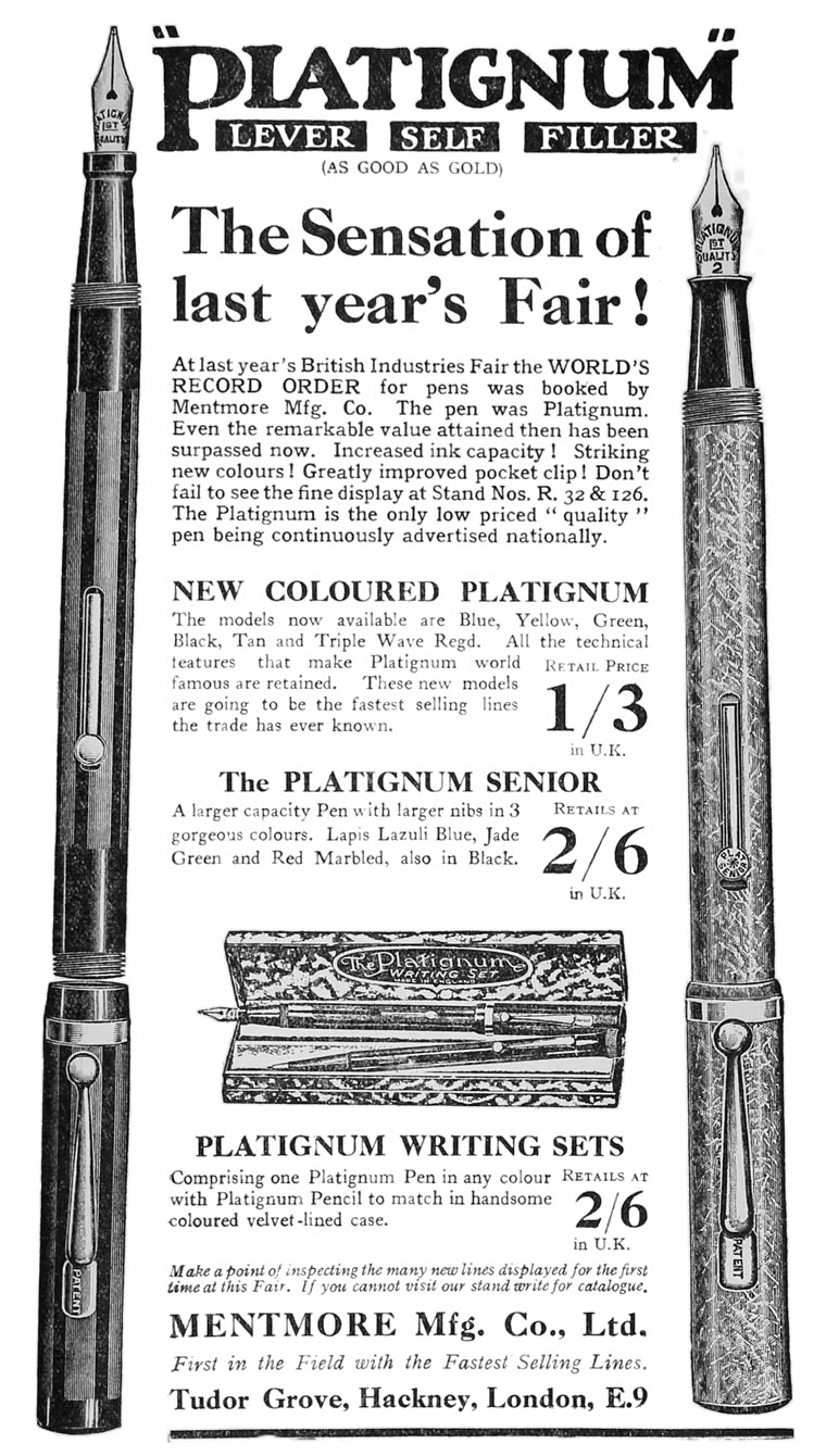 Scanning of advertising from Platignum dated 1929. Retouched by the author for a better sharpness. Dating established by the publication date of the volume from which the page is taken. Advertising for the Lever Self Filler models. Mention production by "Mentmore Mfg. Co. Ltd.". From "1929 British Industries Fair" catalog. Republished from https://www.gracesguide.co.uk/, where the image is published under GFDL at page: https://www.gracesguide.co.uk/File:Im1929BIF-Mentomore.jpg.