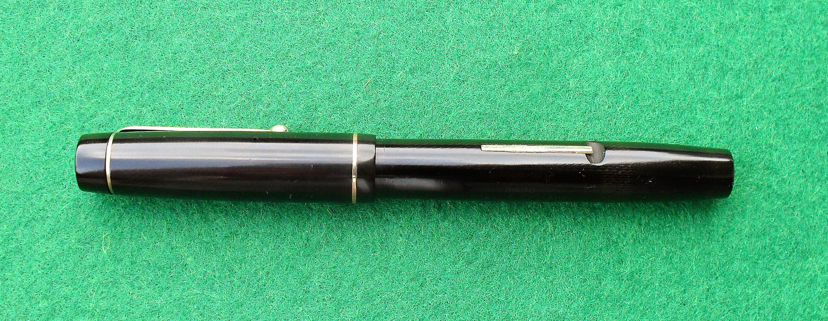 Foto di una penna Summit (un marchio della Lang - Curzon - Summit). Modello: Summit S.100. Caricamento a levetta. Realizzazione in ebanite nera. Versione di inizio anni '30, con pennino originale con stampigliatura "warranted" circolare. Contributo di Alberto (utente forum A Casirati).