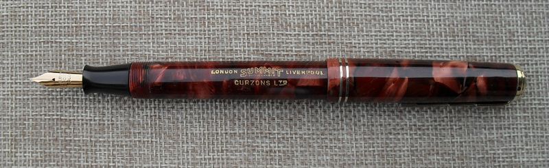 Foto di una penna Curzons (un marchio della Lang - Curzon - Summit). Modello: Summit S.112. Caricamento a levetta. Realizzazione in celluloide marmorizzata rossa. Modello più antico ancora marcato Curzons, in celluloide colorata marcato Unbreakable. Contributo di Alberto (utente forum A Casirati).