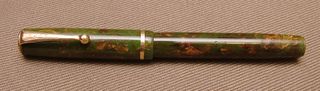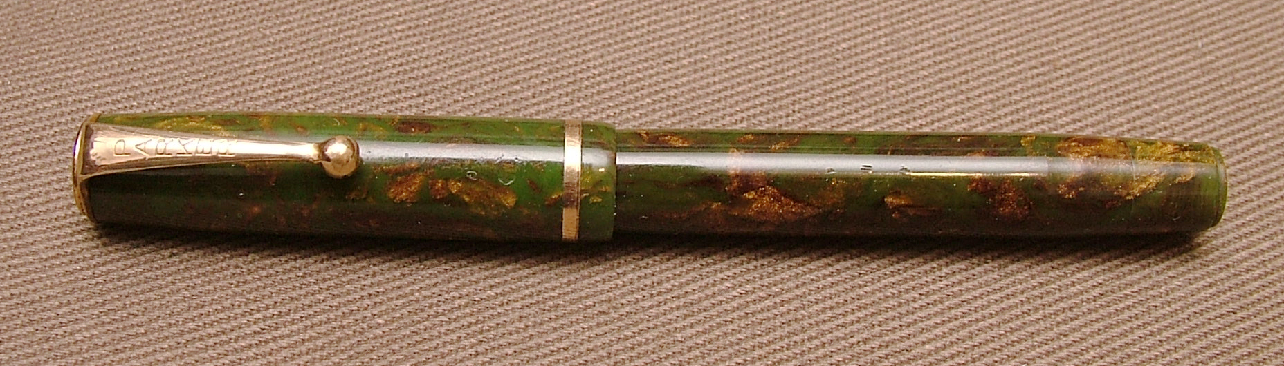 Photo of a pen produced by Parker. Model: Parker Moderne. Filling system: button filler. In green with bronze celluloid. A model belonging to the class of pens called by collectors "Depression era pen".