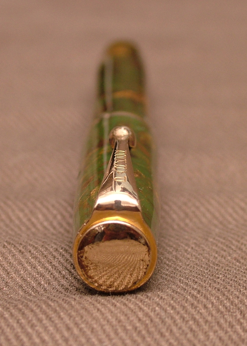 Photo of a pen produced by Parker. Model: Parker Moderne. Filling system: button filler. In green with bronze celluloid. A model belonging to the class of pens called by collectors "Depression era pen".