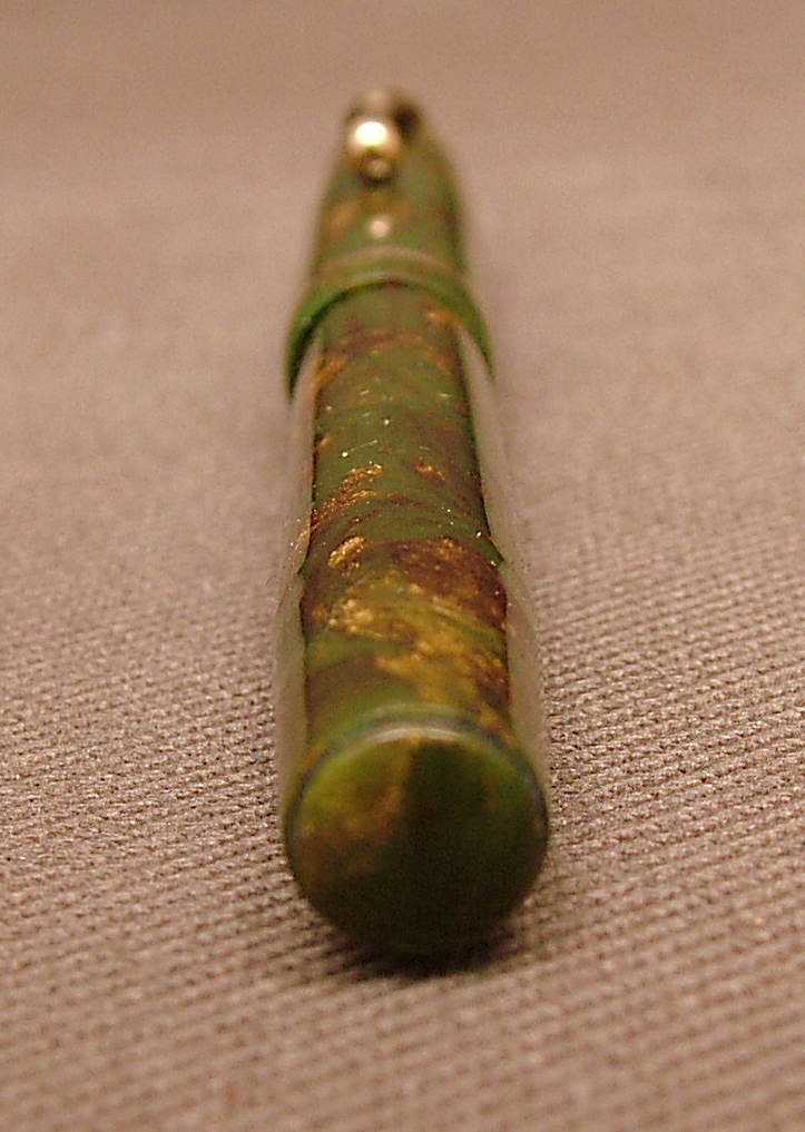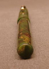 Photo of a pen produced by Parker. Model: Parker Moderne. Filling system: button filler. In green with bronze celluloid. A model belonging to the class of pens called by collectors "Depression era pen".