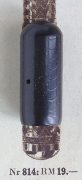 Photo of a pen produced by Soennecken. Model: Soennecken 814. Filling system: safety. In black hard rubber. Detail of cap. Courtesy of Fiocchetti (utente forum Fiocchetti).