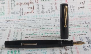 Photo of a pen produced by Blackbird (sub-band of Swan). Model: Blackbird Self Filler. Filling system: lever filler. In black celluloid. Specific model denomination unknown.