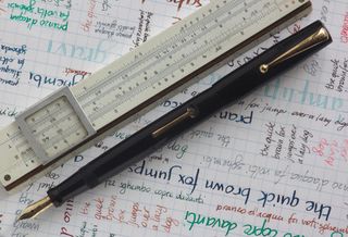 Photo of a pen produced by Blackbird (sub-band of Swan). Model: Blackbird Self Filler. Filling system: lever filler. In black celluloid. Specific model denomination unknown.