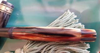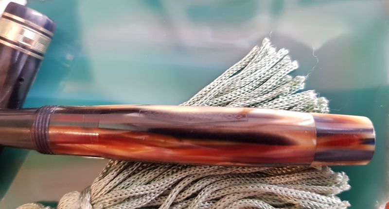 Photo of a pen produced by Columbus. Model: Columbus 100. Filling system: button filler. In striated brown celluloid. Detail of inscription. Lady model.