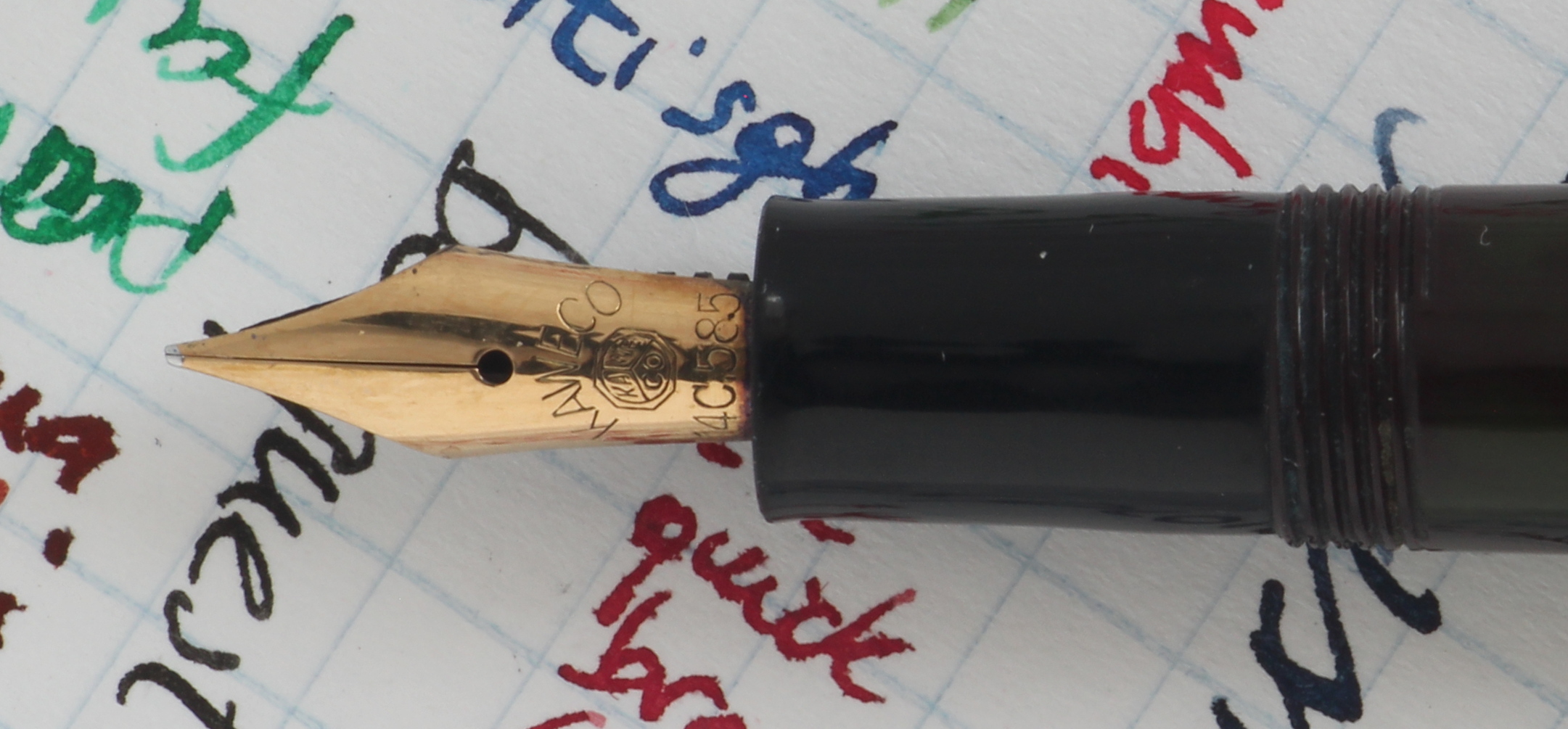 Photo of a pen produced by Kaweco. Model: Dia 805. Filling system: piston filler. In black plastic resin. Detail of nib. Marked for "08" nib (oblique F).