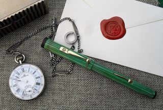 Foto di una penna Curzons (un marchio della Lang - Curzon - Summit). Modello: Summit H.65. Caricamento a levetta. Realizzazione in celluloide a strisce verdi (bamboo). Testa del cappuccio in ebanite. Contributo di Alberto (utente forum A Casirati).