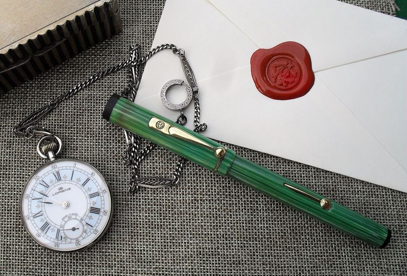 Photo of a pen produced by Curzons (a Lang - Curzon - Summit trademark). Model: Summit H.65. Filling system: lever filler. In striped green (bamboo) celluloid. Hard rubber cap head.