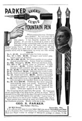 Scansione di una pubblicità Parker datata 1903. Pubblicazione su: Harper's Magazine. Ritoccata dall'autore per una migliore nitidezza. Data indicativa, per aver trovato una frazione del testo su google books per una pubblicazione di quell'anno (Harper's Montly Magazine, n. 108). Pubblicizza una serie di modelli Parker Lucky Curve, e una Jack Knife Safety, cita in particolare i modelli No. 1, No. 20 o 020, No. 023, No. 024 o 24, No. 25, No. 5, No. 11, No. 12, No. 30 e No. 40.