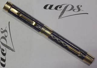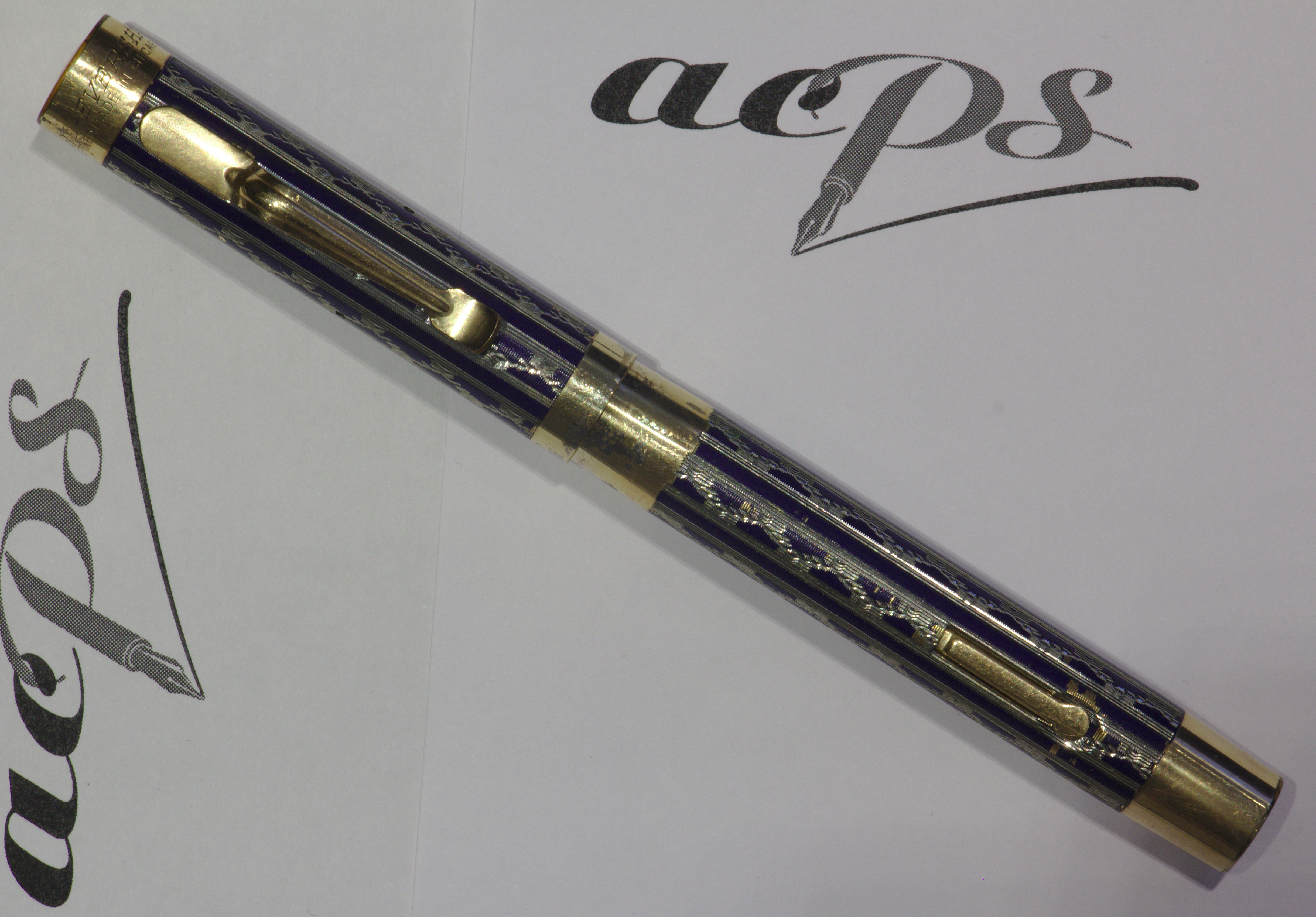 Photo of a pen produced by Eversharp. Model: Wahl Metal Pen. Filling system: lever filler. In blue enameled engine turned gold filled metal. Medium size, in the New Lakeside pattern. Courtesy of Cliff Harrington. Photographed at 2018 Bologna Pen Show.