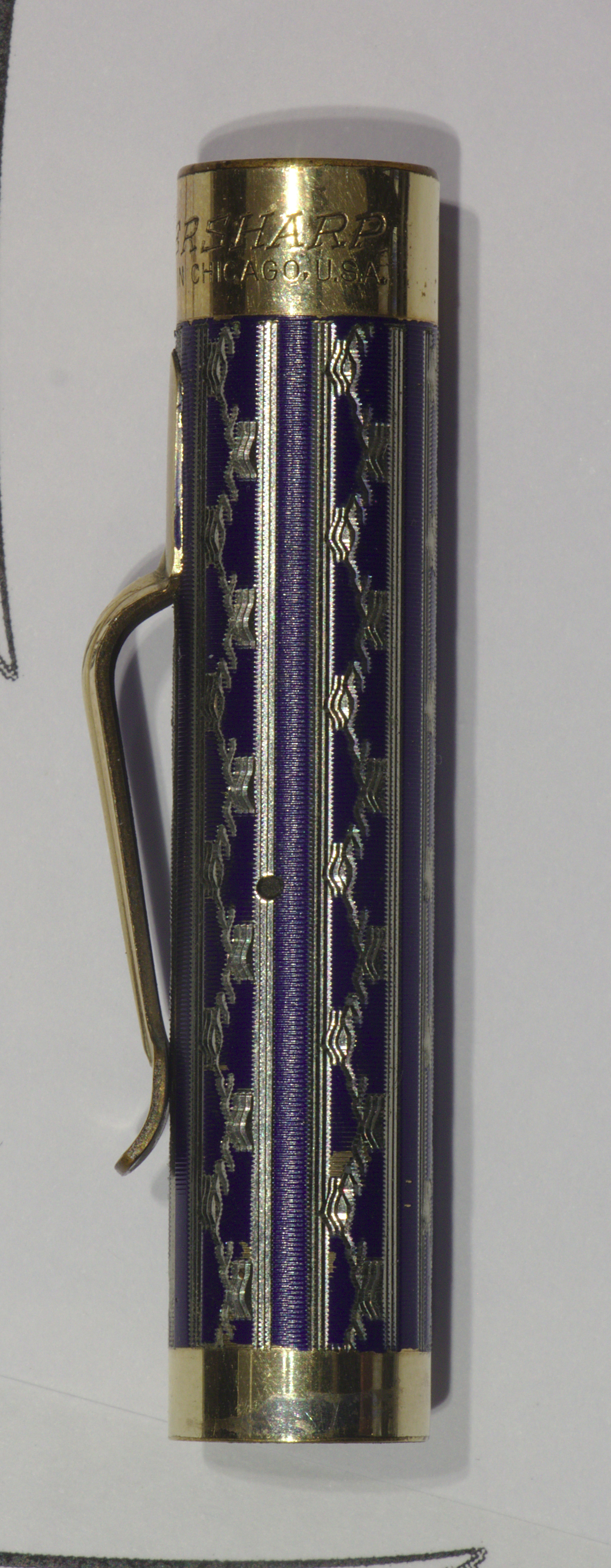 Foto di una penna Eversharp. Modello: Wahl Metal Pen. Caricamento a levetta. Realizzazione in metallo laminato oro con lavorazione guilloché e smalto blu. Dettaglio del cappuccio. Misura media, nella lavorazione New Lakeside. Messa a disposizione da Cliff Harrington. Fotografata al Pen Show di Bologna del 2018.