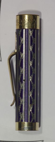 Photo of a pen produced by Eversharp. Model: Wahl Metal Pen. Filling system: lever filler. In blue enameled engine turned gold filled metal. Detail of cap. Medium size, in the New Lakeside pattern. Courtesy of Cliff Harrington. Photographed at 2018 Bologna Pen Show.