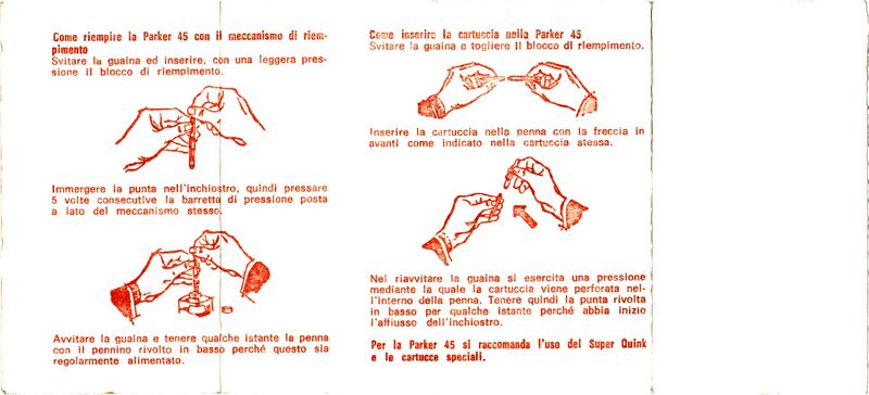 Scansione di un foglietto di garanzia Parker degli anni '50. Relativo ad un modello Parker 45. Retro, lato delle istruzioni. Sull'altro lato di File:Parker-45-Sheet-Front-Warranty.jpg. Da una confezione originale.