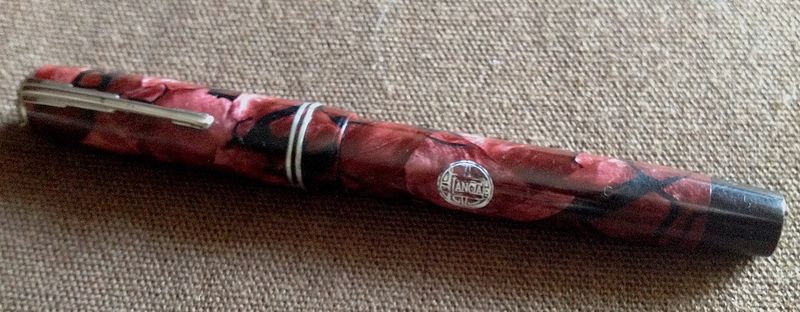 Photo of a pen produced by Atena. Filling system: button filler. In marbled red celluloid. Unknown model, scaled clip identical to the one of some pen of the Summit Serie S., Lancia brand advertising.