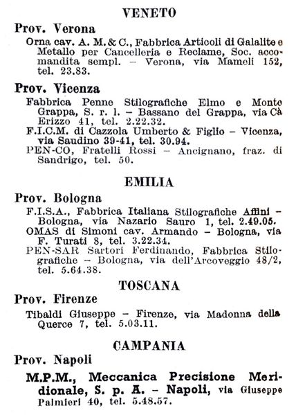 Scansione di un annuario del 1956. Tratta da: "Annuario generale dell'industria e del prodotto italiano", edito da "Satet - Torino" e compilato da "Confederazione generale dell'industria italiana". Contributo di Paolo (utente forum PG1964TO). Concerne le aziende: Orna, Montegrappa, Pen-Co, Omas, Pen-Sar, Tibaldi e M.P.M.. Terza pagina relativa ai produttori di stilografiche. Altri proprietari citati: Cazzola Umberto (F.I.C.M.), Simoni Armando (Omas), Sartori Ferdinando (Pen-Sar), Tibaldi Giuseppe (Tibaldi).