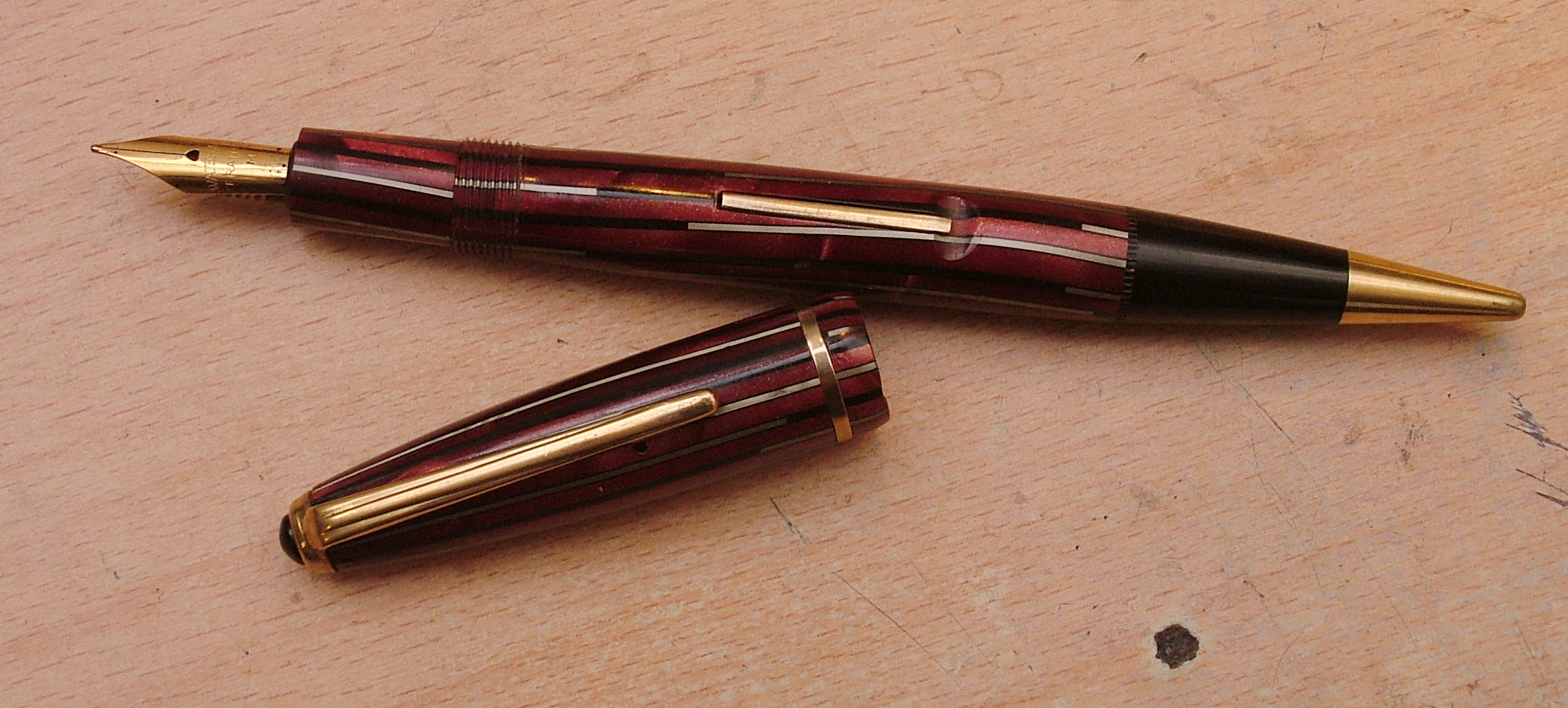 Foto di un combo stilografica/matita meccanica Surgens. Caricamento a levetta. Realizzazione in celluloide rossa a striscioline bianche. Modello ignoto. Contributo di Massimo (utente forum maxpop55).