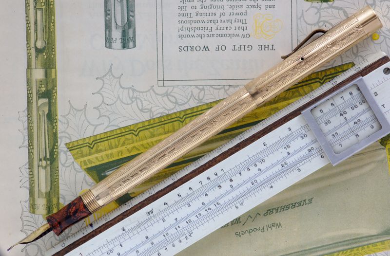 Foto di una penna Eversharp. Modello: Wahl Metal Pen. Caricamento a levetta. Realizzazione in metallo laminato oro con lavorazione guilloché. Misura lunga, nella lavorazione Console.