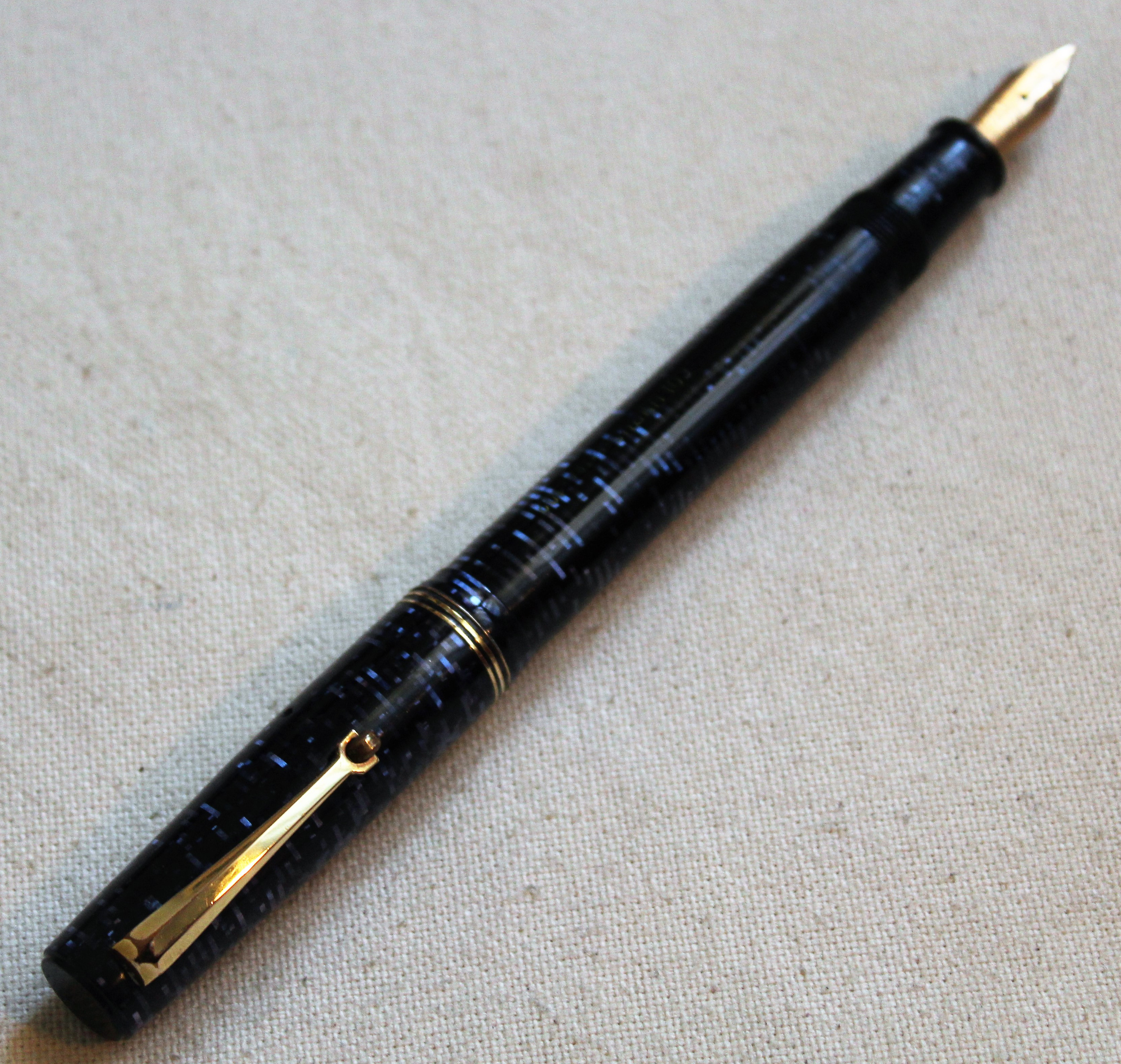 Photo of a pen produced by Columbus. Model: Columbus Extra 102. Filling system: button filler. In blue ringed celluloid.