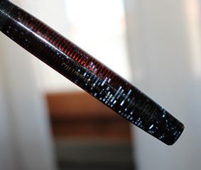 Foto di una penna Columbus. Modello: Columbus Extra 102. Caricamento a siringa rovesciata. Realizzazione in celluloide anellata blu. Dettaglio del corpo. Contributo di Fabrizio Falchi, (utente forum fountainpen.it fab66).