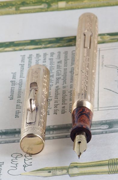 Foto di una penna Eversharp. Modello: Wahl Metal Pen. Caricamento a levetta. Realizzazione in metallo laminato oro con lavorazione guilloché. Misura lunga, nella lavorazione Console.