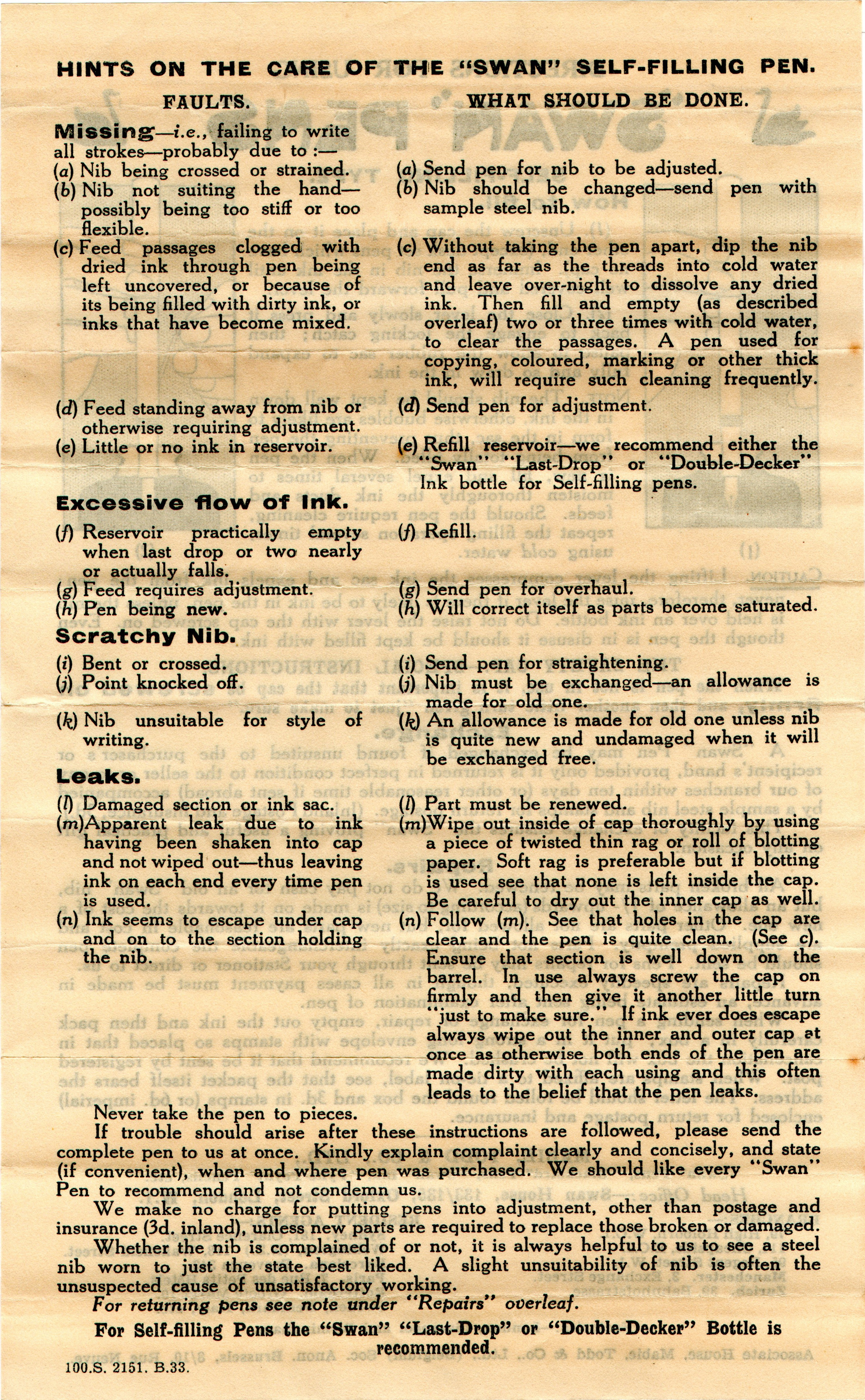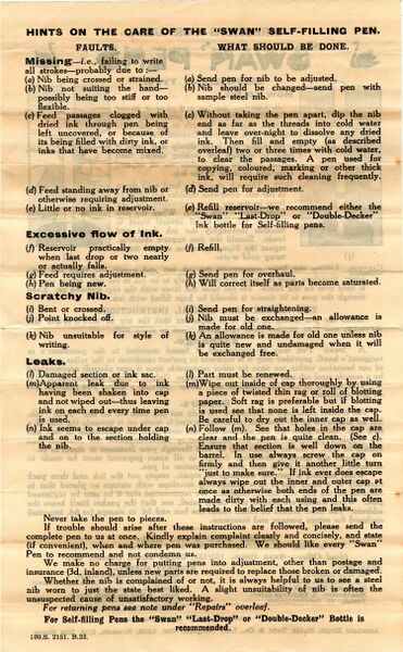 Scanning of a Swan instruction sheet from '20s. For a Swan SF 2 model. Back. On the other side of File:Swan-SelfFilling-192x-Instro-Front.jpg. Retouched by the author for a better sharpness. From an original package.