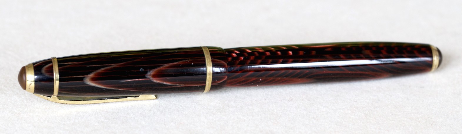 Foto di una penna Columbus. Modello: Columbus 134. Caricamento a levetta. Realizzazione in celluloide rossa simil arco. Contributo di Luca (utente forum LucaC).