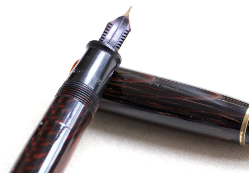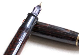 Foto di una penna Columbus. Modello: Columbus 134. Caricamento a levetta. Realizzazione in celluloide rossa simil arco. Contributo di Luca (utente forum LucaC).