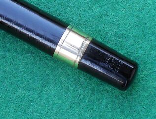 Foto di una penna Swan. Modello: Swan 362. Caricamento a contagocce. Realizzazione in ebanite nera. Dettaglio del fondo. Modello con doppia banda dorata, numero riportato sul fondello. Contributo di Alberto (utente forum A Casirati).