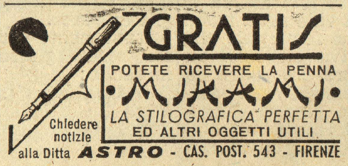Scansione di una pubblicità Astro datata 1943-07-04. Pubblicazione su: La Domenica del Corriere, anno 45, n. 27. Indica come indirizzo: "Cas. Post. 543, Firenze". Data ottenuta da quella di pubblicazione del volume da cui la pagina è estratta. Pubblicizza il modello Mikami.
