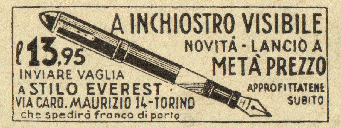 Scanning of advertising from Cortese dated 1943-07-04. Published on: La Domenica del Corriere, year 45, n. 27. Mention as address: "Via Card. Maurizio, 14, Torino". Dating established by the publication date of the volume from which the page is taken. Advertisement for an unknown model with visible ink.