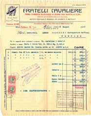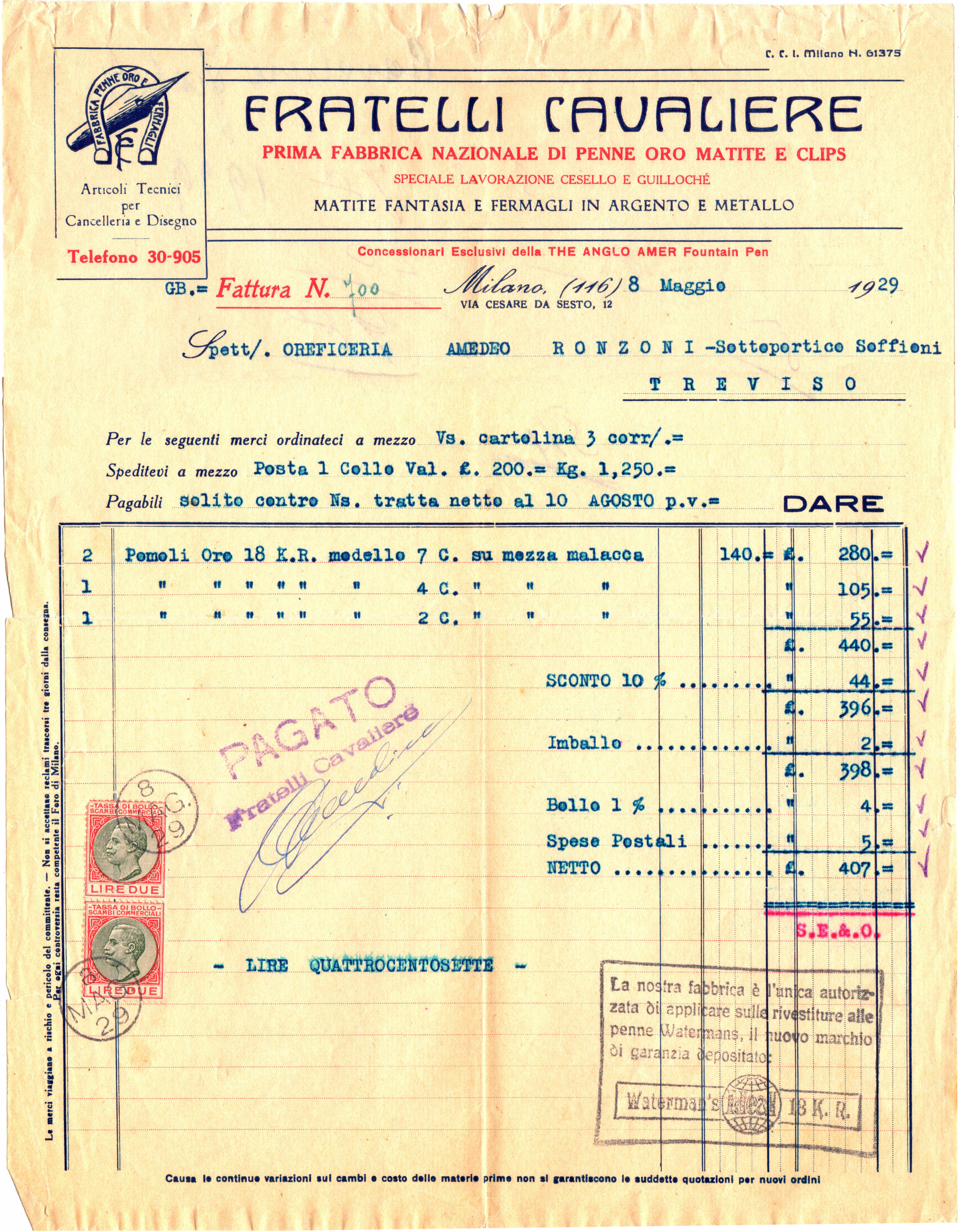 Scanning of an invoice from Fratelli Cavaliere dated 1929-05-08. Date directly visible. Invoice for laminated knobs to a goldsmith's workshop. Indicates the company as the exclusive agent of "The Anglo Amer Fountain Pen". It has a stamp indicating the factory as the only one authorized to produce overlays for Waterman pens, and the relative guarantee hallmark. Mention as address: "Via Cesare da Sesto, 12". Retouched by the author for a better sharpness.