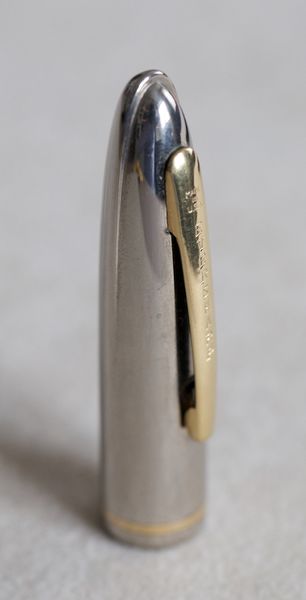 Foto di una penna Eversharp. Modello: Symphony. Caricamento a levetta. Realizzazione in resina plastica nera. Dettaglio del cappuccio. Seconda versione. Contributo di Luca (utente forum LucaC).
