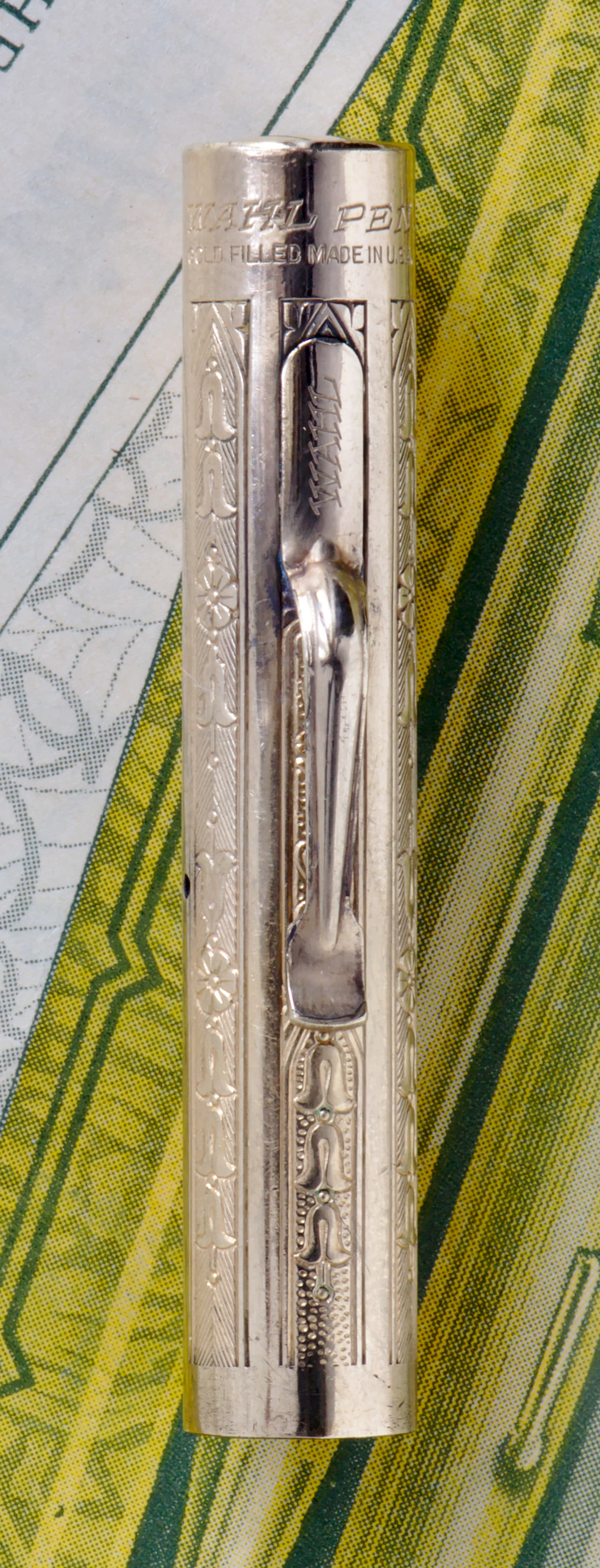 Photo of a pen produced by Eversharp. Model: Wahl Metal Pen. Filling system: lever filler. In engine turned gold filled metal. Detail of cap. Long size, in the Console pattern.