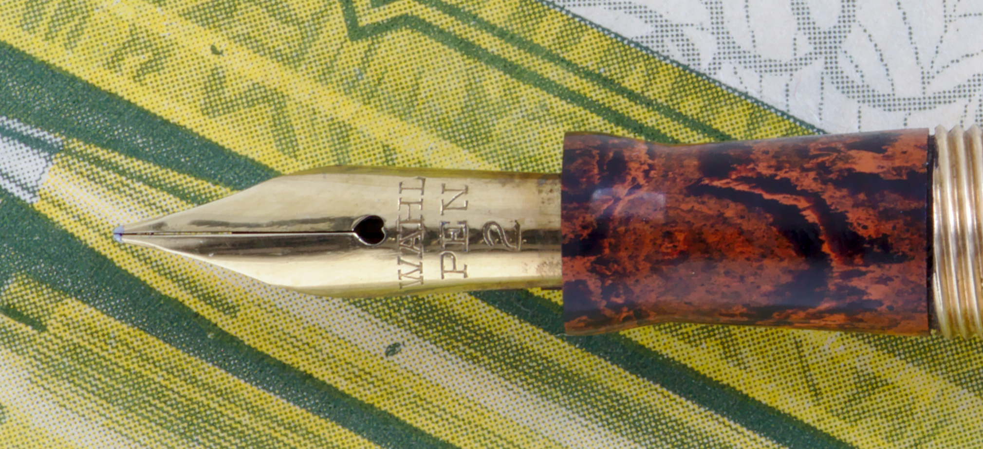 Photo of a pen produced by Eversharp. Model: Wahl Metal Pen. Filling system: lever filler. In engine turned gold filled metal. Detail of nib. Long size, in the Console pattern.