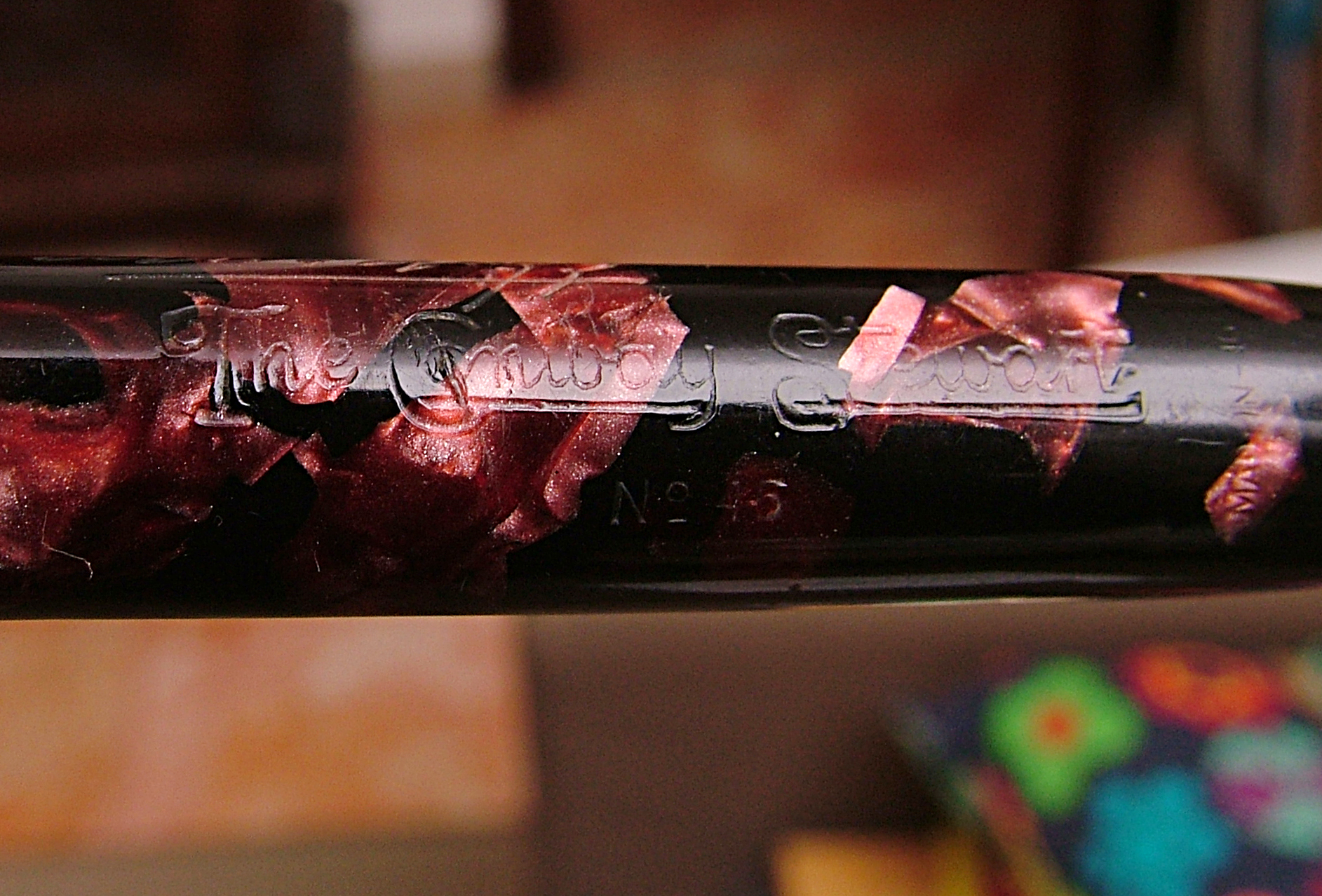 Photo of a pen produced by Conway Stewart. Model: Conway Stewart 45. Filling system: lever filler. In red marbled celluloid. Detail of inscription.