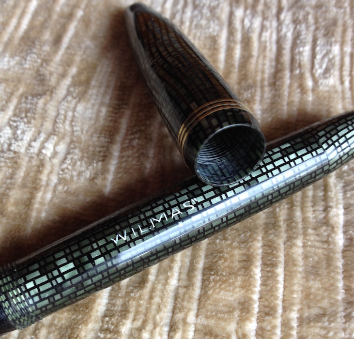 Photo of a pen produced by Wilmas. Filling system: button filler. In green lizard skin celluloid. Unknown model.