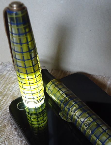 Photo of a pen produced by Alfa-Ro (a Roccati trademark). Filling system: button filler. In transparent crossing lines celluloid. Unknown model.