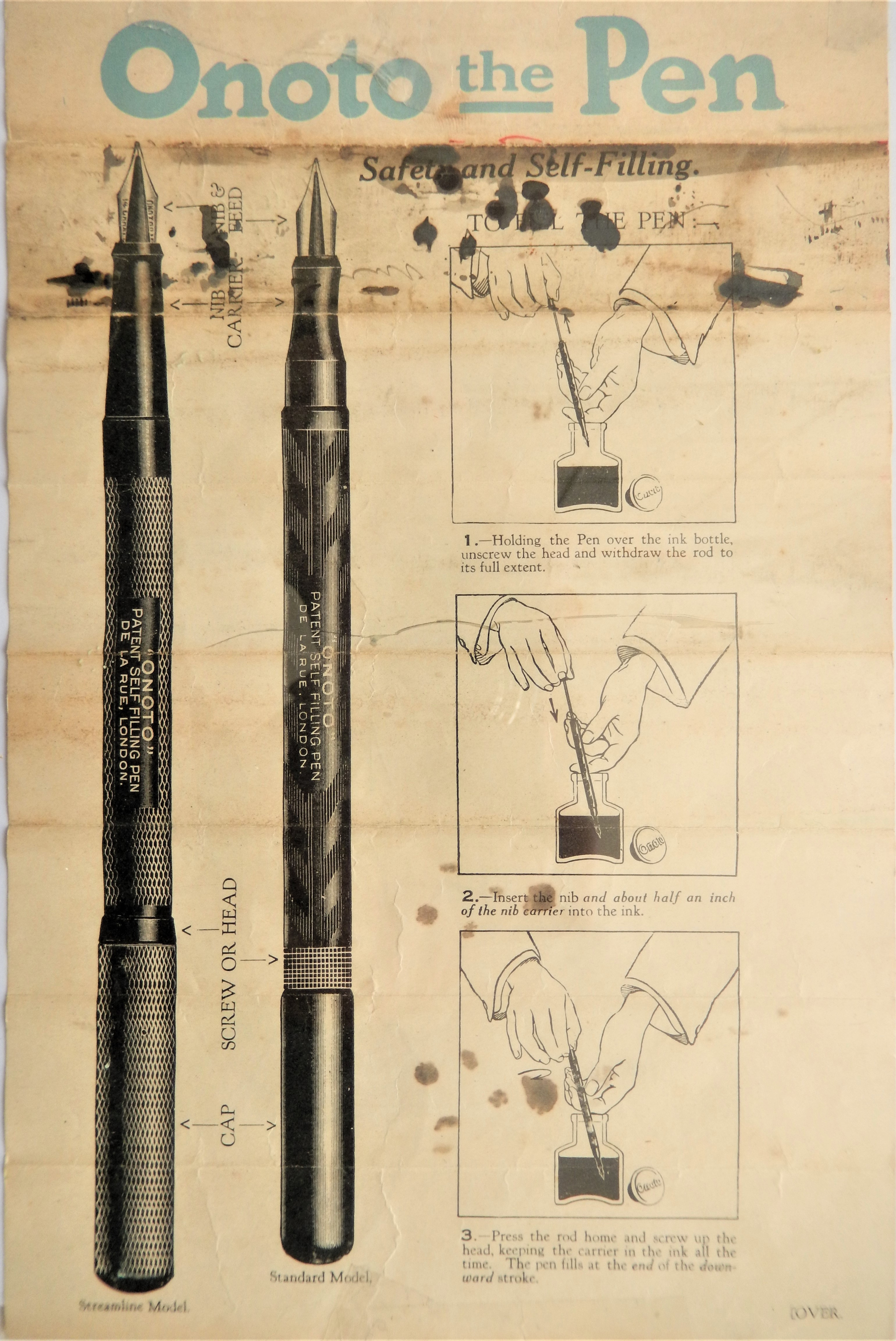 Scanning of a Onoto instruction sheet from '10s. For a Onoto N model. Front. On the other side of File:Onoto-N-Istro-Back.jpg. Contributed by Lucre. From an original package.