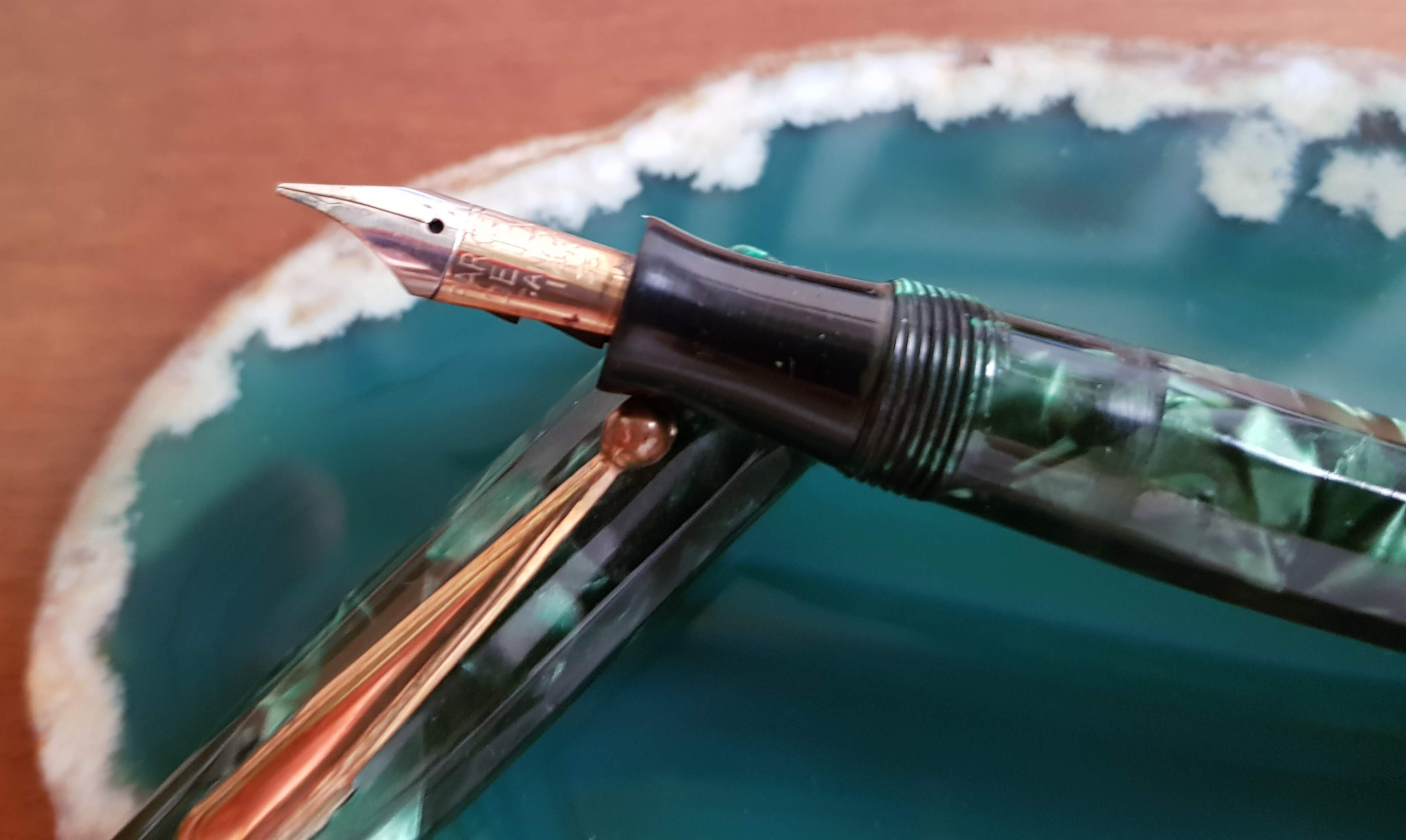 Photo of a pen produced by Parker. Model: Parkette De Luxe. Filling system: lever filler. In marbled turquoise celluloid. Color out of the catalogue.