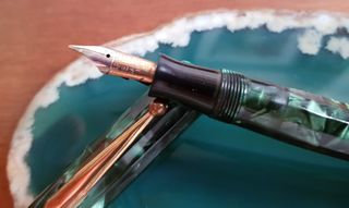 Foto di una penna Parker. Modello: Parkette De Luxe. Caricamento a levetta. Realizzazione in celluloide marmorizzata turchese. Colore fuori catalogo. Contributo di roccopin (utente forum roccopin).