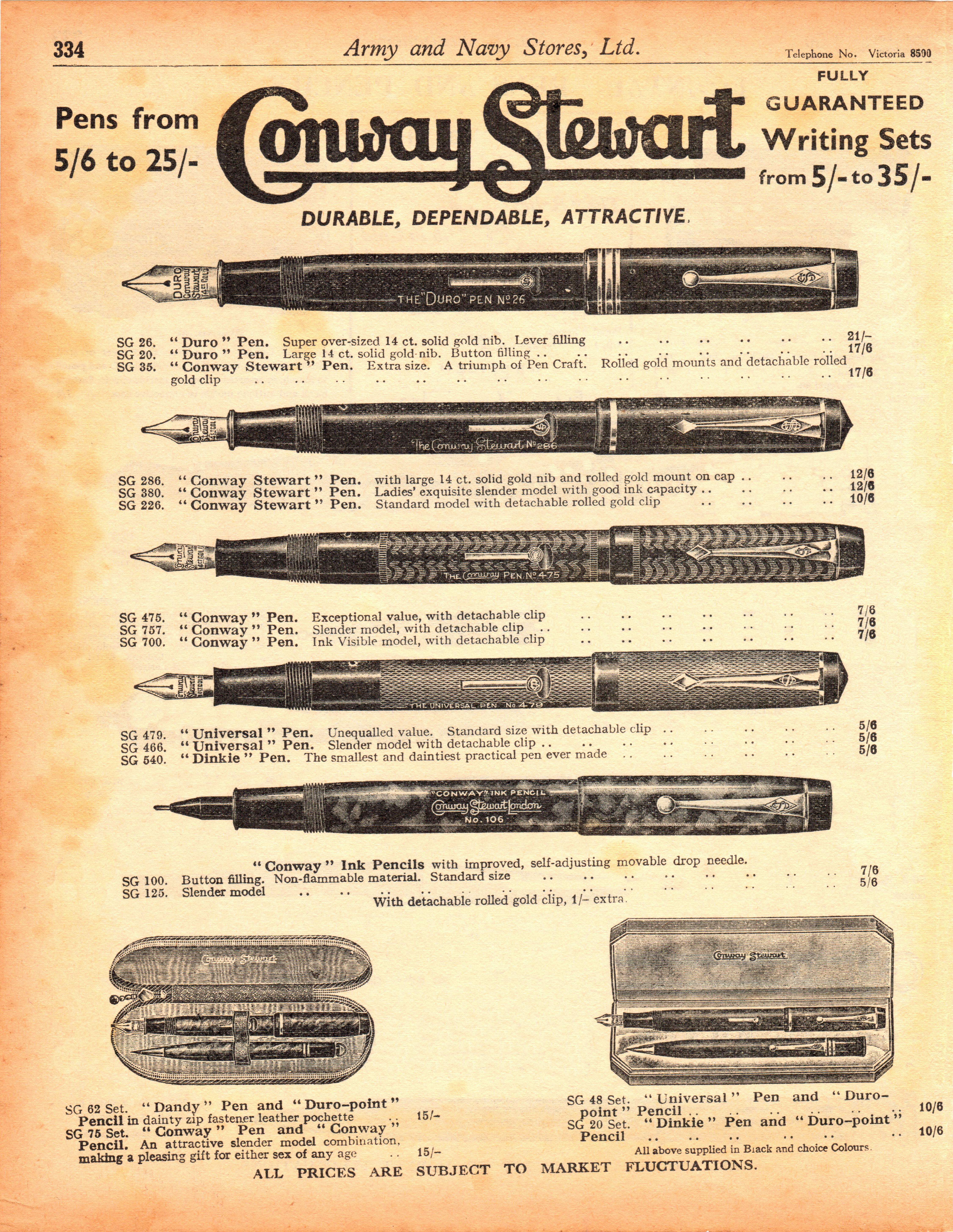 Scansione di una pagina di catalogo datata 1939. Pubblicazione su: Army & Navy Stores Catalog. Ritoccata dall'autore per una migliore nitidezza. Data indicata dal fornitore, affidabile. Pagina dedicata alla Conway Stewart, pubblicizza una serie di modelli diversi: Duro 26 ("super over-sized", caricamento a levetta), Duro 20 ("large", pulsante di fondo), Conway Stewart 35 (extra size), Conway Stewart 286, Conway Stewart 380, Conway Stewart 475, Conway Stewart 757, Conway Stewart 700, Universal 479, Universal 466, Dinkie 540, alcune penne a stilo (Conway Ink Pencil), e varie combinazioni penna/matita.