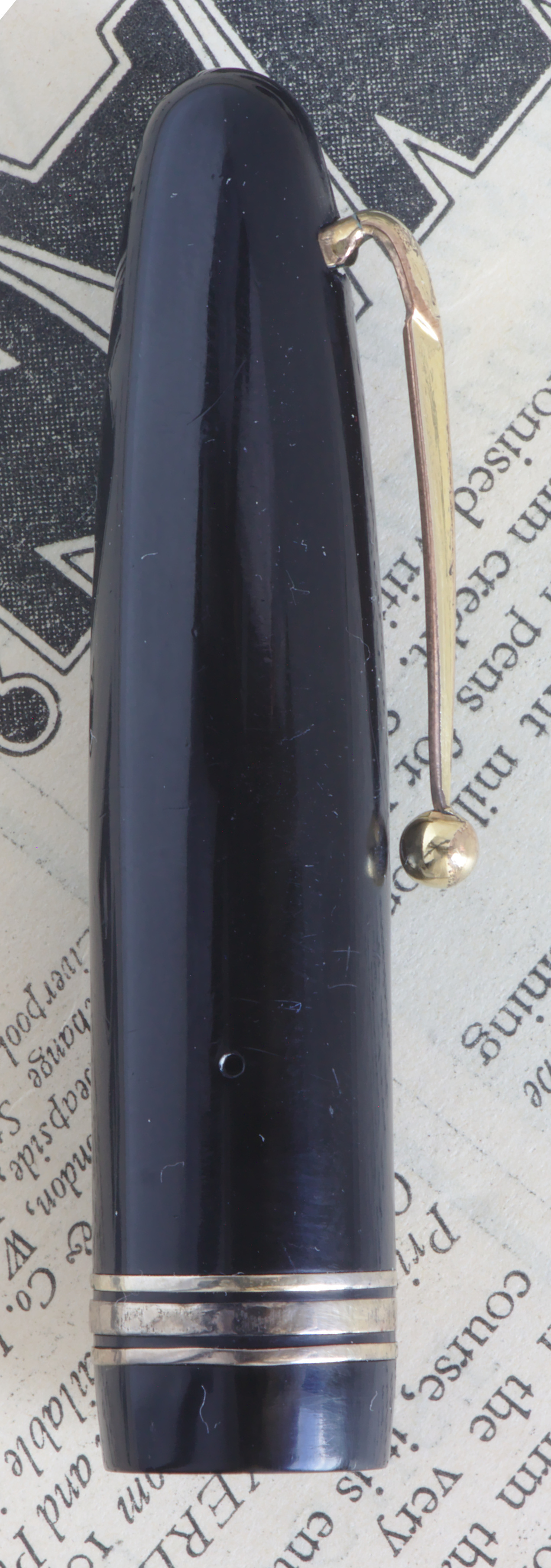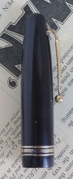 Photo of a pen produced by Swan. Model: Leverless Pen. Filling system: "Leverless". In black celluloid. Detail of cap. Model marked 2060, post-war streamlined version, #6 nib.