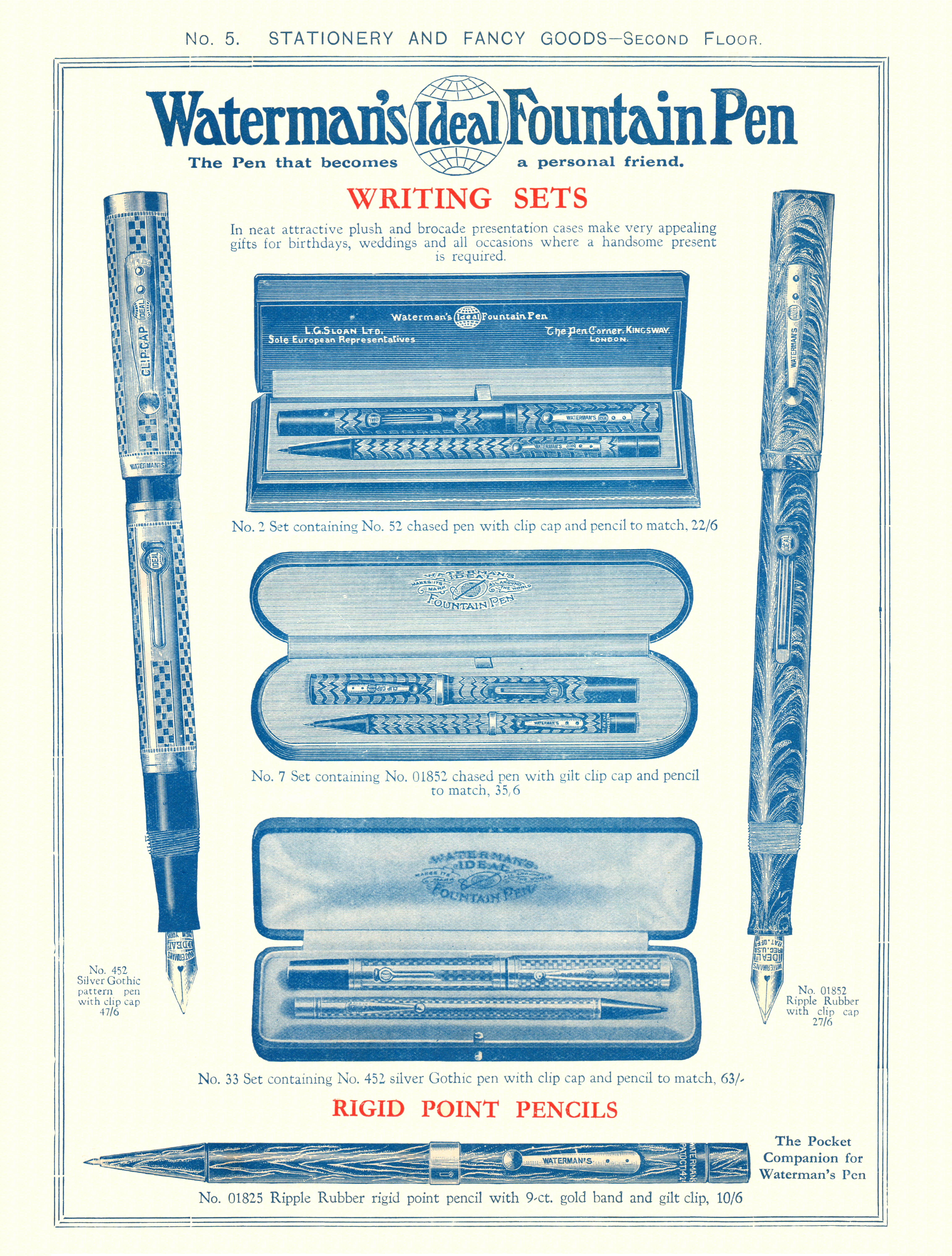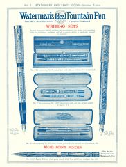 Scansione di una pagina di catalogo datata 1929. Pubblicazione su: Army & Navy Stores Catalog. Ritoccata dall'autore per una migliore nitidezza. Data indicata dal fornitore, affidabile. Pagina dedicata alla Waterman, pubblicizza una serie di modelli diversi: Waterman 452, Waterman 52 e Waterman 01852 anche in set con le relative matite meccaniche. Sull'altro lato di File:1929-ArmyNavyCatalog-p429-Waterman.jpg.