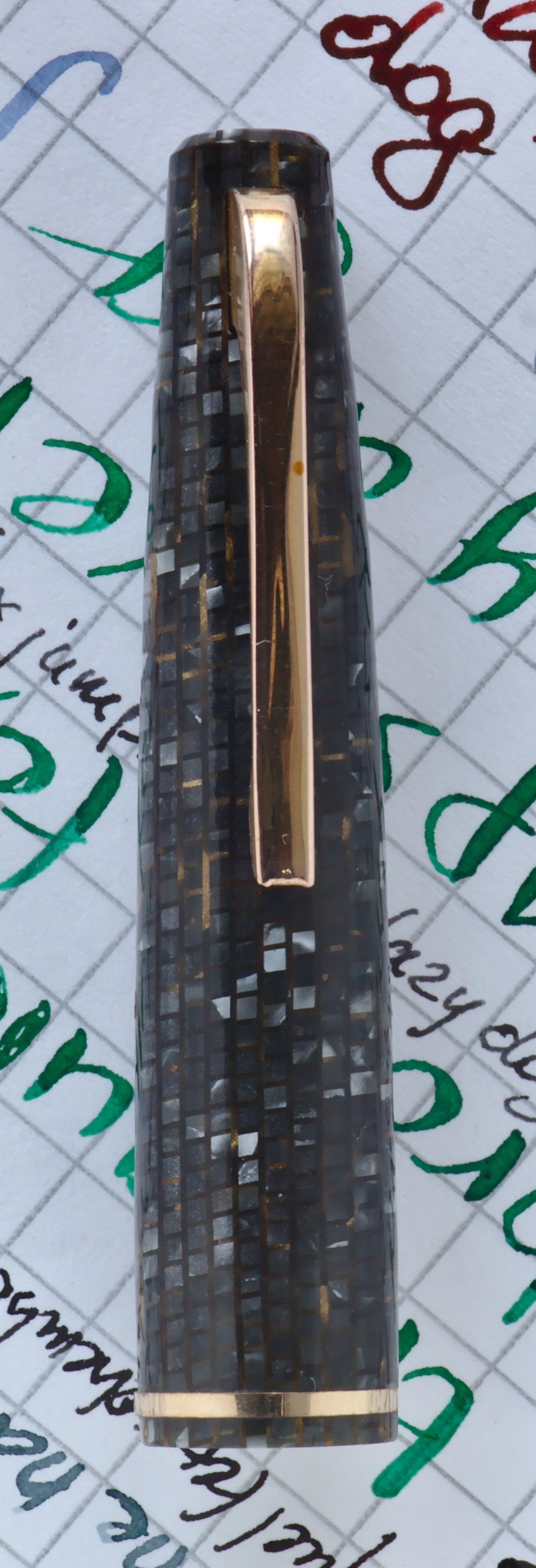 Photo of a pen produced by Bayard. Model: Bayard 746. Filling system: accordion filler. In blue with checkered strips celluloid. Detail of cap. Small model.