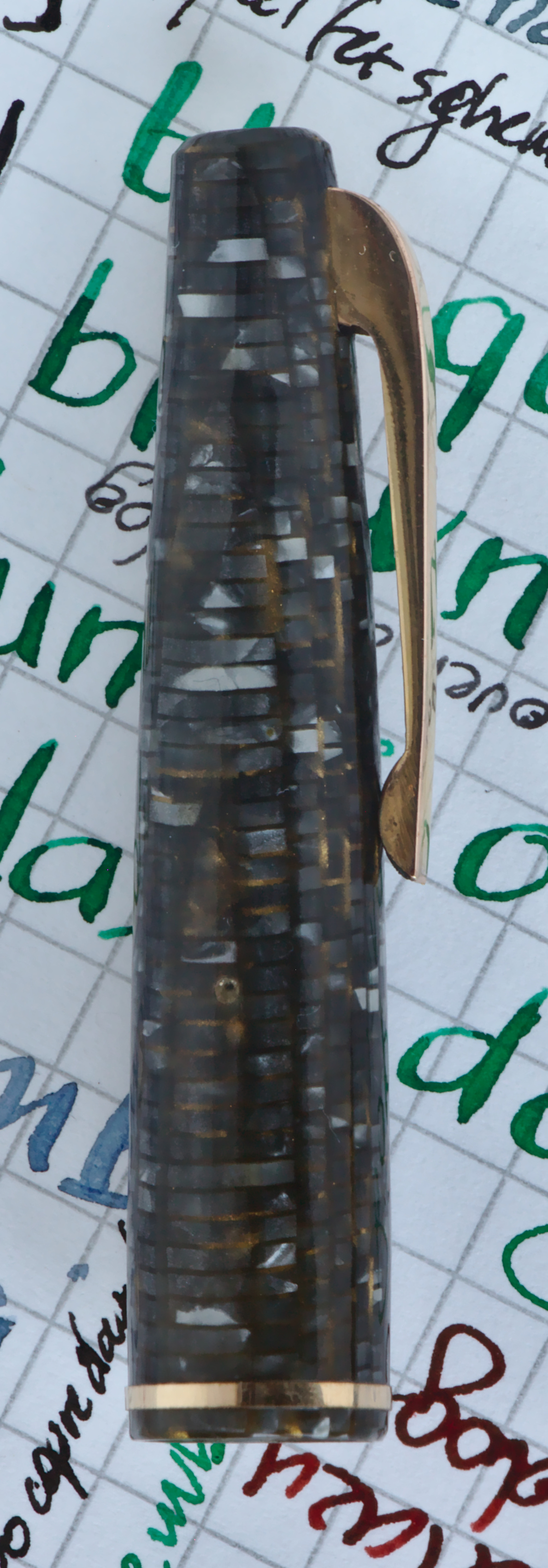 Photo of a pen produced by Bayard. Model: Bayard 746. Filling system: accordion filler. In blue with checkered strips celluloid. Detail of cap. Small model.